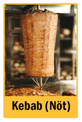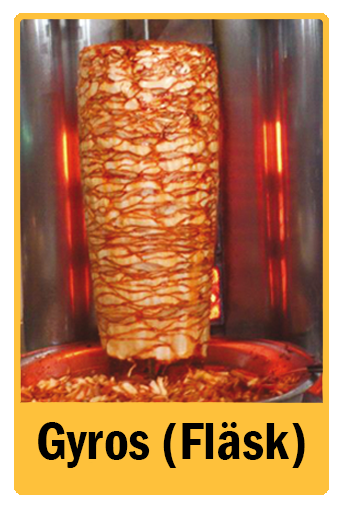Vi har både nötkebab och gyroskebab. Även vegetarisk alternativ med falafel.